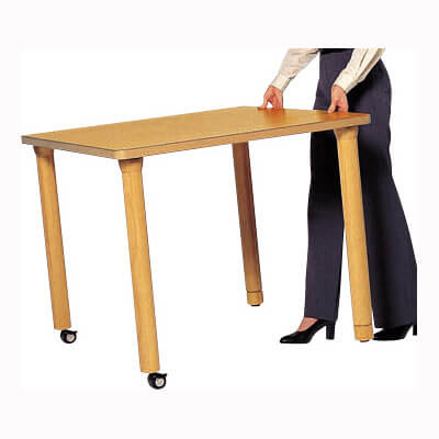 抗菌メラミンを使用した天板と優しい印象の木脚を組合わせた定番スタイル。脚端にジョイントパーツを取り付けてテーブル高さを調整できます。カラーは使いやすい2色をラインナップ。コストパフォーマンスの高いモデルです。